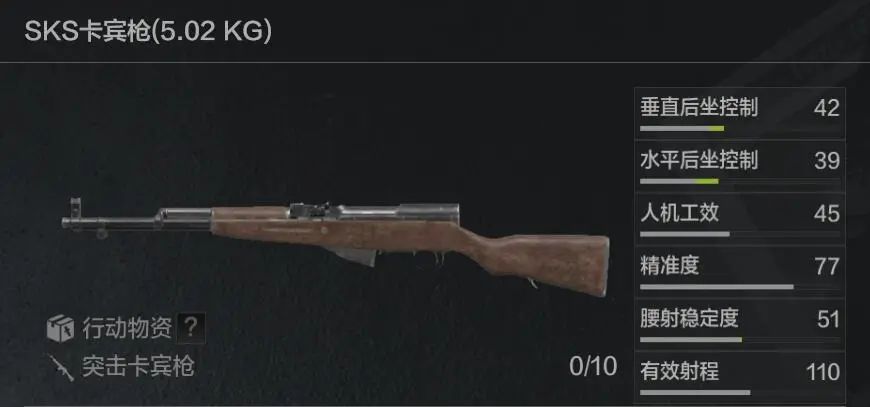 SKS是一把出场率很高的入门级卡.宾.枪,游荡者持有率高,伪装潜入时也经常会随机到。110米的有效射程和77的精准度完全满足了远距离作战的需求,是大家熟悉狙击玩法的入门选择。但它也有一些明显的缺点:原厂SKS的10发弹仓换弹需单发装填,且机瞄的易用性较差,因此建议使用前进行简单改装。首先将弹仓更换为SKS专属20发(或35发)卡口弹匣解决换弹慢的问题,加装专用上轨或镜架后,即可安装瞄具,比如性价比很高的PSO4倍镜。之后再给枪口加装很便宜的SKS专用消音器来提高隐匿性,就可满足中远距离作战的需要。一些习惯了使用SKS的先锋还可以考虑对其进行更深度的改装,如将原厂托更换为现代托并加装后握把,可以显著提升后坐控制和腰射稳定度,再在护木前端安装斜侧导轨增加单倍瞄具,这样就能兼顾不同距离的作战场景。满改的SKS花费并不高,搭配4级穿透的BP子弹(45穿透,59基础伤害,23.4护甲伤害)足以威胁到半装甚至全装先锋。
