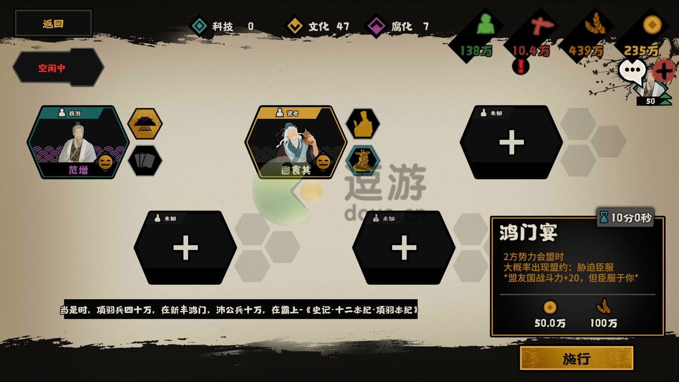 也就是说 一个决水至少有两个要重新刷好感的国家,但决水是非五星范增刚需 ,所以在决水先刷臣服的赵的好感保证不跳反,其次再将两个国家刷到80+好感,臣服一个联盟另一个,最后劝降诸侯咸服结局