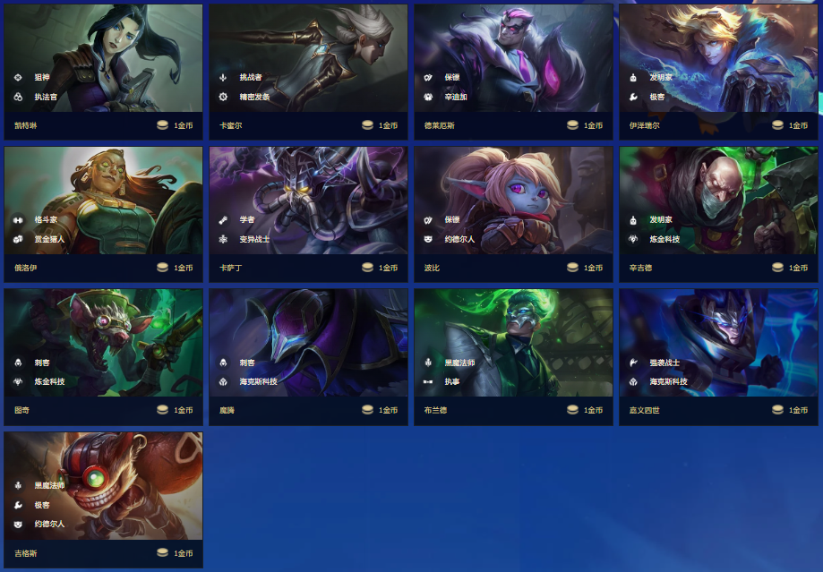 凯特琳、卡蜜尔、德莱厄斯、伊泽瑞尔、俄洛伊。卡萨丁、波比、辛吉德、图奇、魔腾、布兰德、嘉文四世、吉格斯