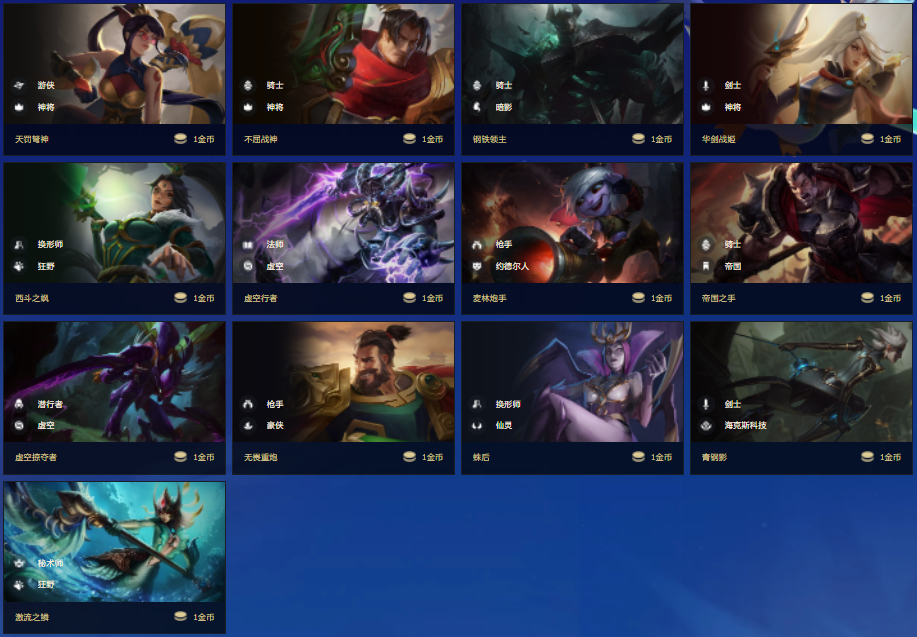 天罚弩神、不屈战神、钢铁领主、华彩剑姬、西斗之飒、虚空行者、麦林炮手、帝国之手、虚空掠夺者、无畏重炮、蛛后、青钢影、流浪之鳞