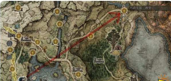 灵药圣杯瓶位于第一张地图的玛莉卡第三教堂处,在这里玩家可以捡到圣杯瓶。位置示意图(红色箭头为初始赐福到目的地)。