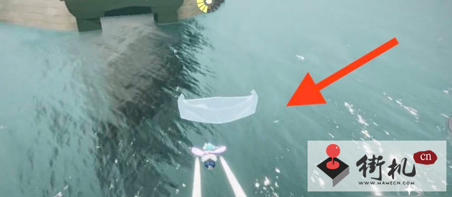 3、看完动画之外,玩家要飞到小船尾部的前方,在灯塔下面有一个小船,玩家需要飞到小船上去潜入到海中,具体如下图。