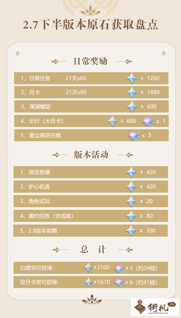 版本剩下的活动只剩下「深泥奇谭」和「炉心机造」,预计分别可获得420原石。「深泥奇谭」活动需要开启层岩巨渊地图才能参加哦,想必经过危途迷踪活动后大家都开了吧。「炉心机造」活动除了活动原石和材料外还能拿到丑萌丑萌的机器人家园摆件~