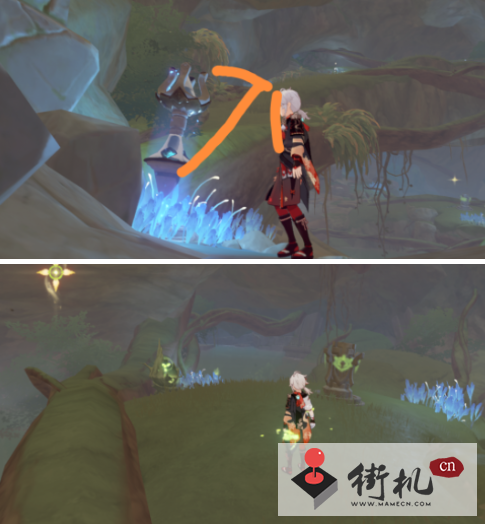 3、来到地方后,往右边看,就会看到一个斜坡,往上走,就会看见一个死域核,然后把它击破,就可以解开了。