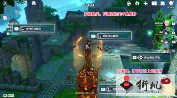 3.打完怪,出现风遁币,机关解封,出现向上的风场,飞上去,先停止附近风场,再把2个机关变换风场朝向各1次,飞到上面开启方块机关,对面的机关解封,再变换风场朝向,即可往上飞到平台。