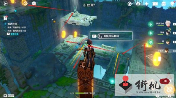1.进入挑战,第一个机关不停风场也没事,可以直接拿,在箭头机关处,变换风场朝向,即可往上飞,拿到风遁币,并飞到对面平台。