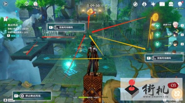 5.先停止附近风场,触碰大微粒,跟着红色箭头逆时针绕一圈,收集元素微粒,再跟着黄色箭头方向,借助机关向上风场飞上来,(如果跑的快,可以直接飞向右边),在中间的机关变换风场朝向,飞到右边,同样的操作,跟着红色箭头方向,再飞过来,然后往前走到终点即可完成台挑战!