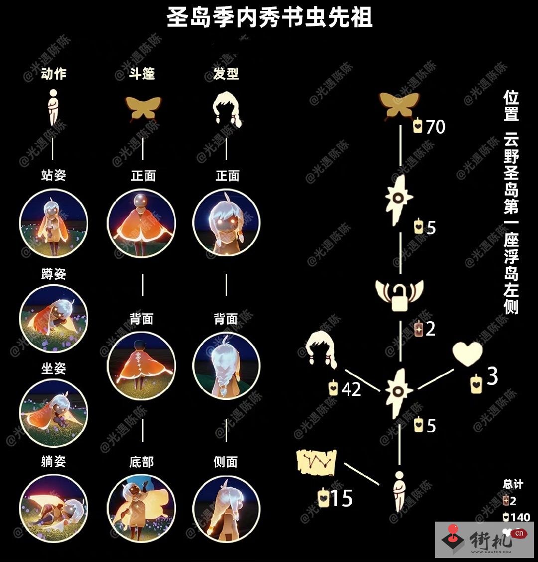 蝴蝶斗篷70蜡烛,发型42蜡烛,乐谱15蜡烛,2个前置节点,一个站姿,一颗爱心,合计需要140蜡烛,2根升华蜡烛。这个先祖很省蜡烛。