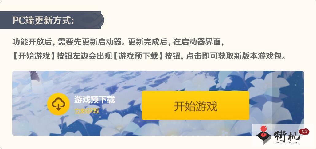 功能开放后,需要先更新启动器。更新完成后,在启动器界面,【开始游戏】按钮左边会出现【游戏预下载】按钮,点击即可获取新版本游戏包。