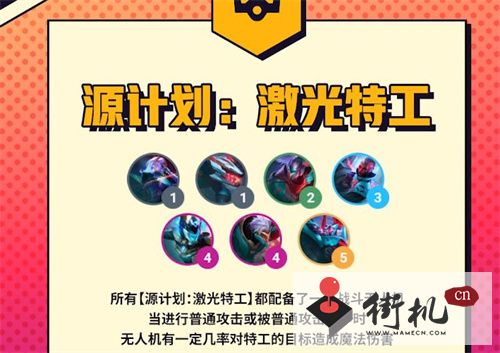 羁绊效果:所有源计划特:激光特工的会分配到一台战斗无人机在进行普攻或者被普攻命中时无人机有几率对该特工攻击的目标造成魔法伤害。