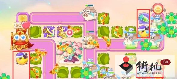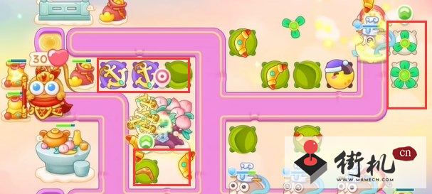 1、本关能够使用的炮塔是:毒针、月亮、船锚、风扇,回旋镖,这一关输出较多且都可以使用。
