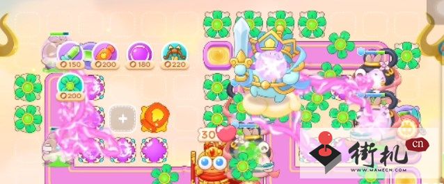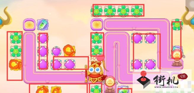 1、本关能够使用的炮塔是:毒针、火瓶、魔法球、风扇、多重箭,这一关我们主要使用风扇和魔法球。