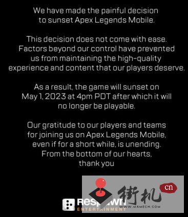 在经历了一个良好的开端后,《Apex Legends Moblie》的游戏质量、内容和节奏出现了问题,EA与合作伙伴共同决定放弃这款游戏。游戏将关闭玩家充值渠道,并从应用商店下架,但已经安装了这款游戏的玩家可以继续游玩,游戏最终将于太平洋时间5月1日下午4点停服。