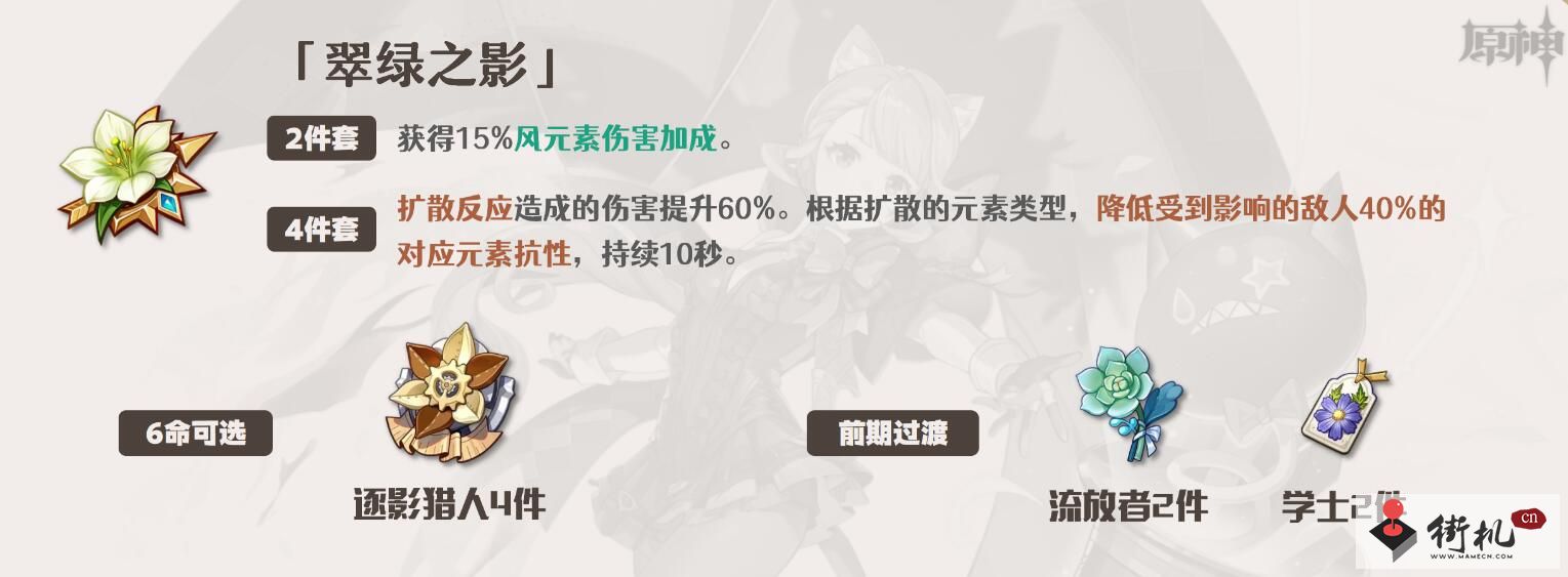 【翠绿之影4】:可以直接搭配「翠绿之影」4件套配合触发扩散反应,加入相关反应队伍中担任辅助。