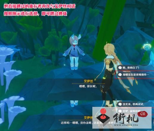 4、如果你实在操作不来也没关系,和艾伊丝对话可以让她代劳,直接跳过这一挑战,后面还有一次发送信号挑战也可以使用同样的方法跳过。