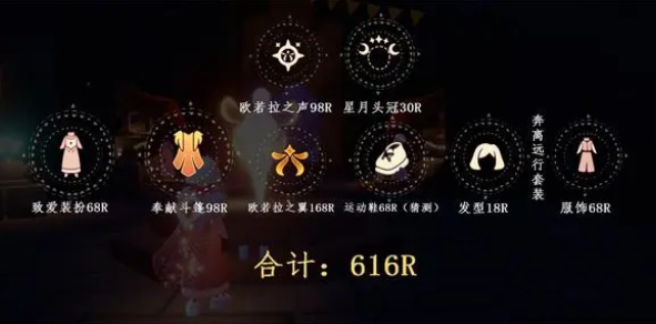 欧若拉季物品:头冠:30rmb、装扮:68rmb、斗篷:98rmb、羽翼:168rmb、鞋子:68rmb、发饰:18rmb、欧若拉之声:98rmb、服饰:68rmb;