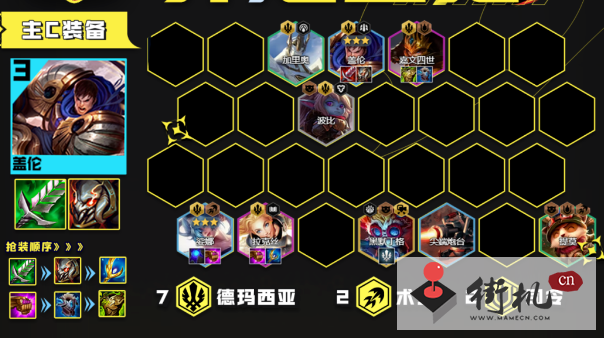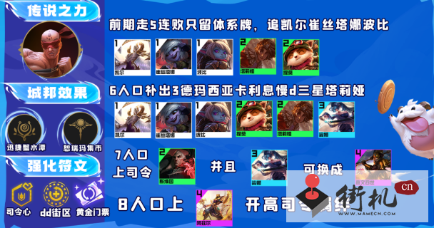 2、阵容羁绊:7德玛西亚2术士2司令3约德尔