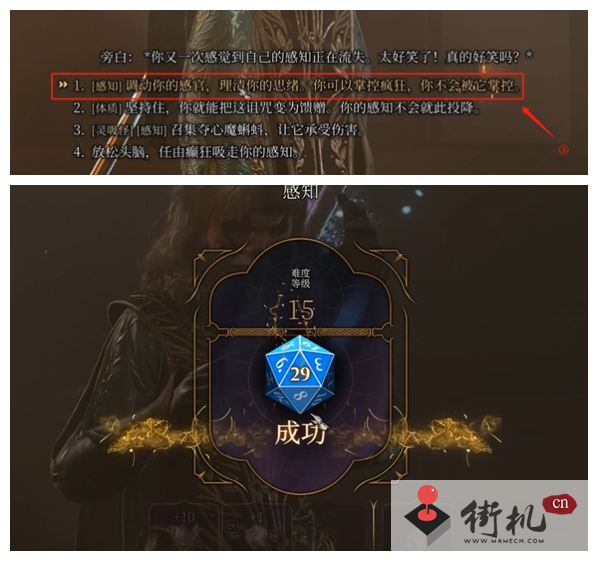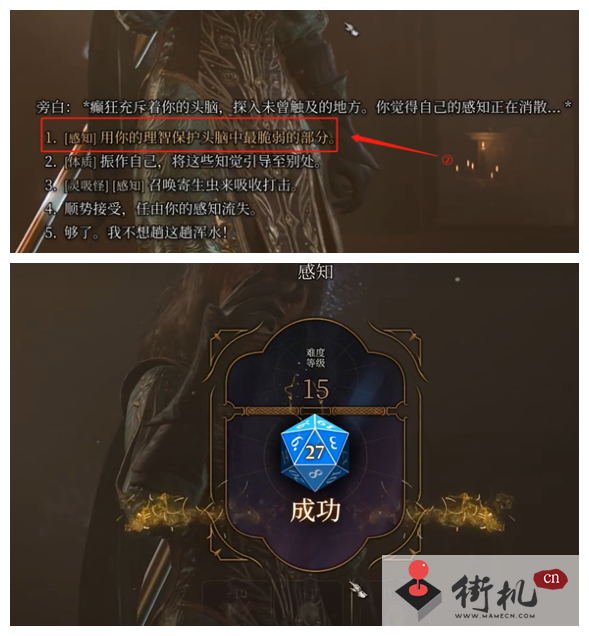 选择后玩家会面临两次掷骰子的选项,第一次选择“用理智保护头脑”开始掷点数。