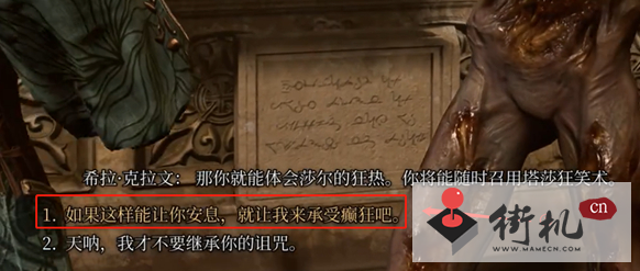 和他对话他会告诉玩家,如果选择接受并克服他身上的诅咒,可以获得塔莎狂笑术,选择“就让我来承受癫狂吧”。