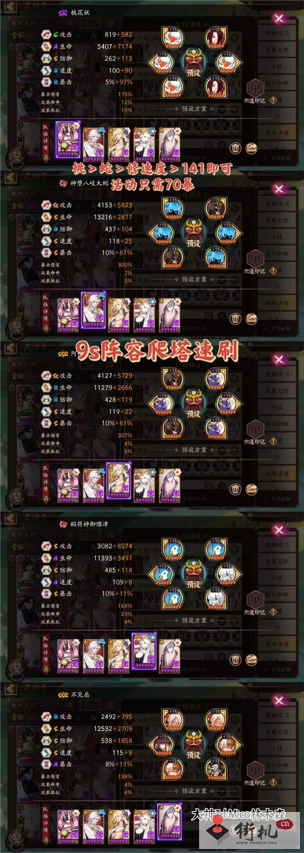 2、9s阵容则因、岳其中一个少的换成钓瓶火桃花妖