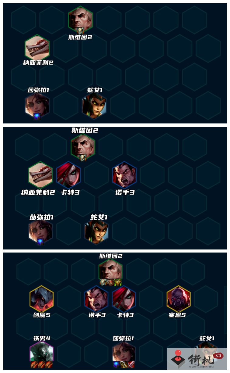 2-3升4人口,上3诺克+纳亚菲利,这个组合没有S9的诺克萨斯过度强,但也属于很不错的过度阵容,换怪能力很强。